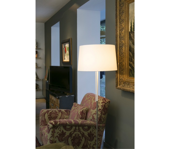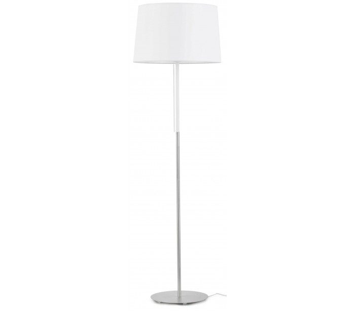 Gulvlampe i et moderne design, fremstillet i kromlakeret metal og med skærm i hvid tekstil. Lampen måler 151 cm i højden og anvender 1 x E27 lyskilde på max. 20W (Ekskl.).
