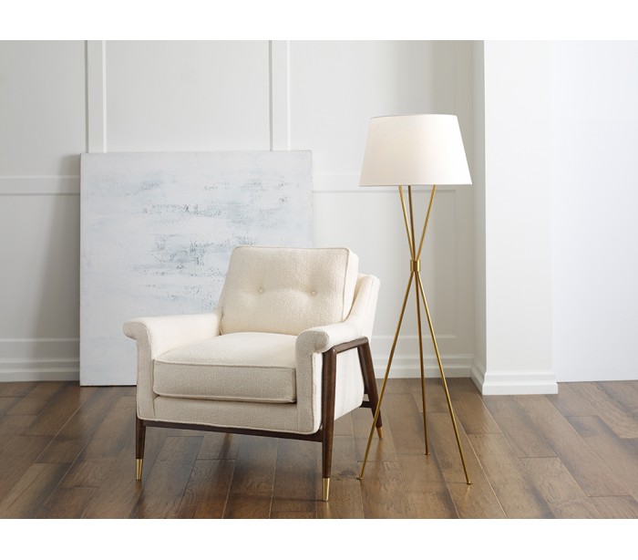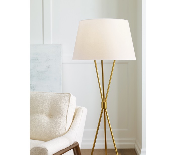Penny gulvlampe i et moderne design, fremstillet i brændt messing og med skærm i hvid linned. Lampen måler 139,7 cm i højden, og anvender 1 x E27 lyskilde (Ekskl.).