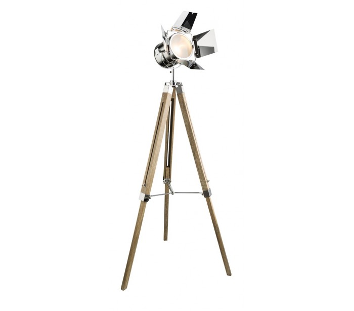 Gulvlampe i et moderne design, med skærm i sølvlakeret metal og trefod i træ. Lampen måler 140 cm i højden og 78 cm i diameter. Benytter 1 x E14 lyskilde på max 25W (Ekskl.).