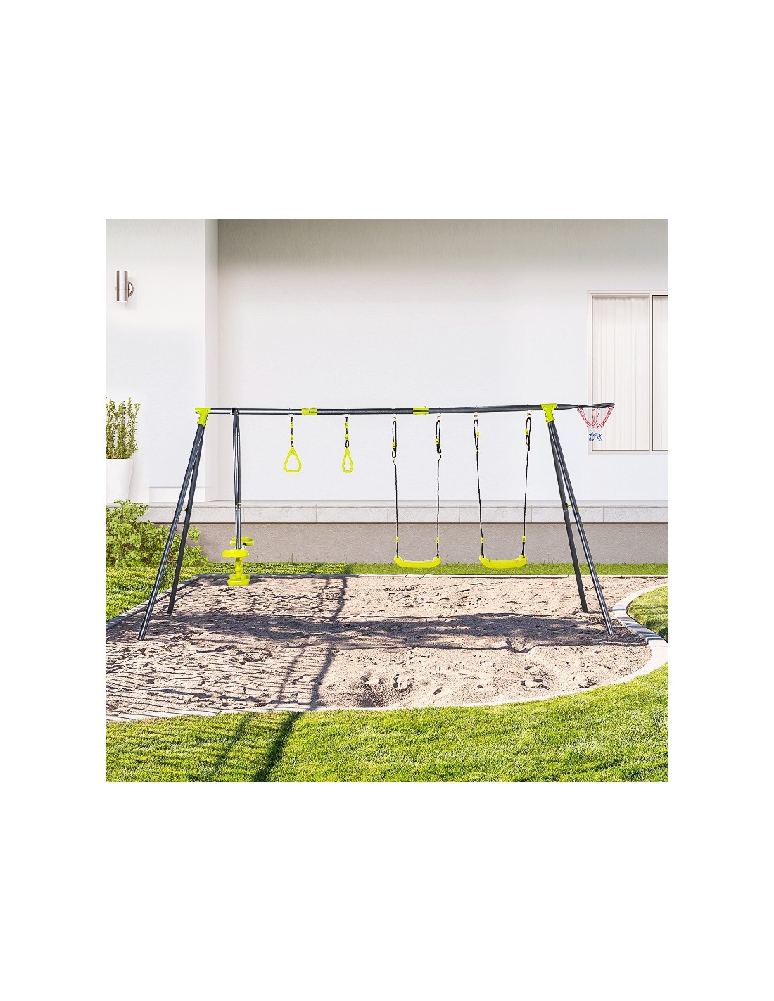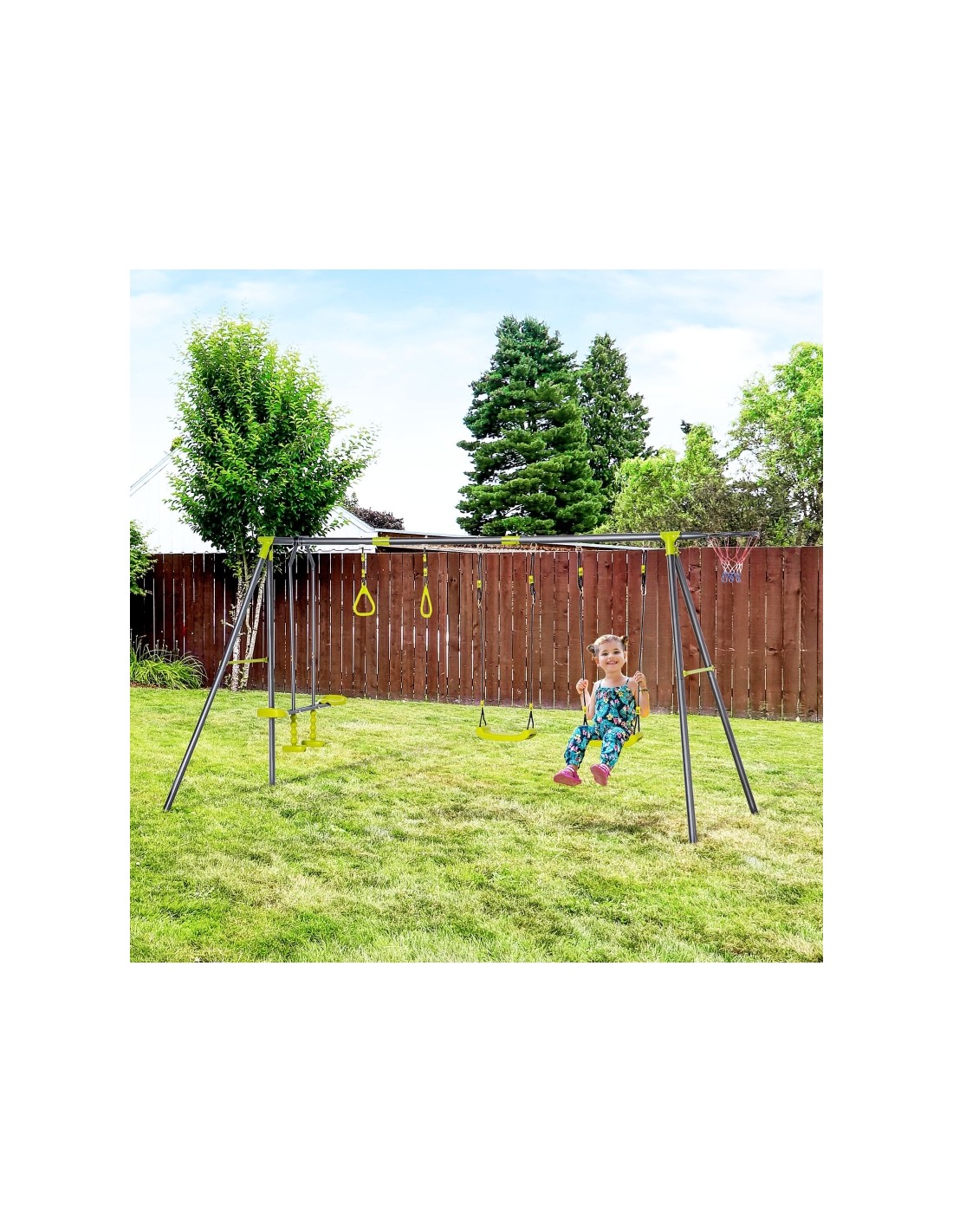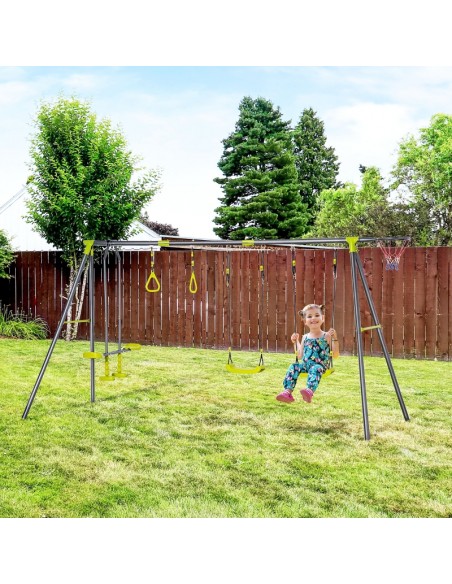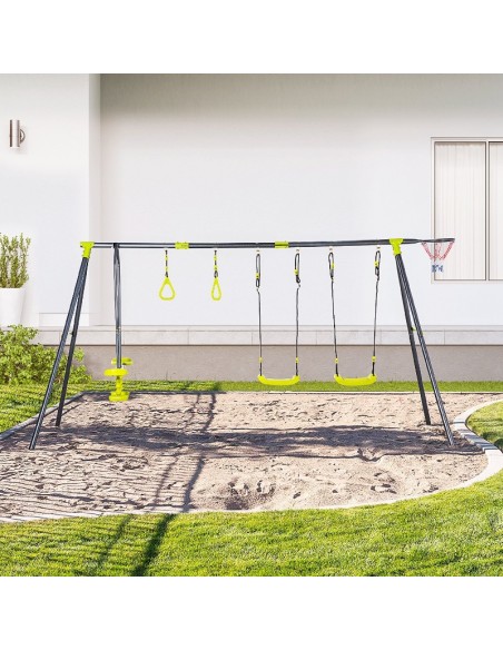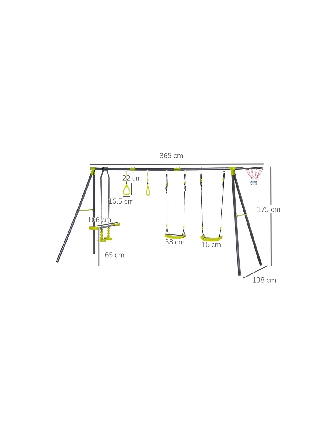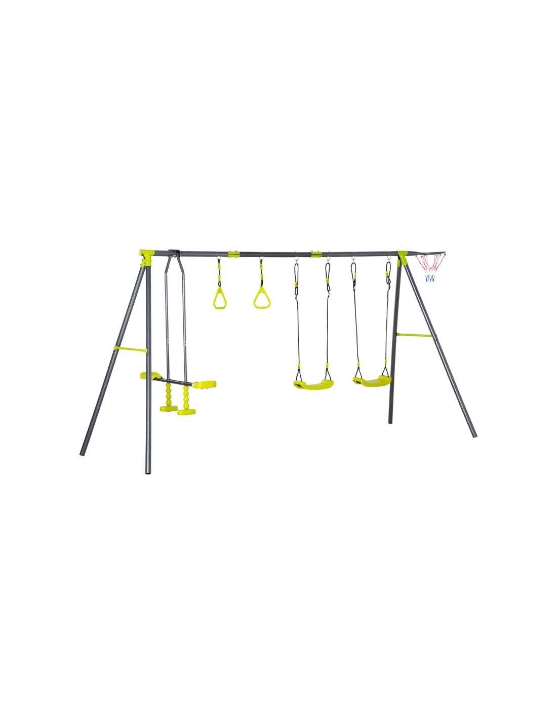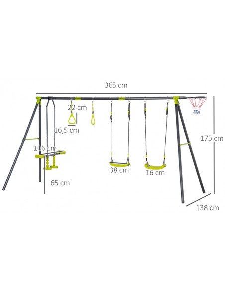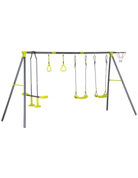 Gyngestativ til børn, udført i et design af stål og kunststof. Gyngestativet måler 175 cm i højden og 365 x 138 cm i bredde og dybde. Max. belastning: 150 kg. Gyngestativet kommer med 3 gynger der er justerbare i højden samt basketball net.