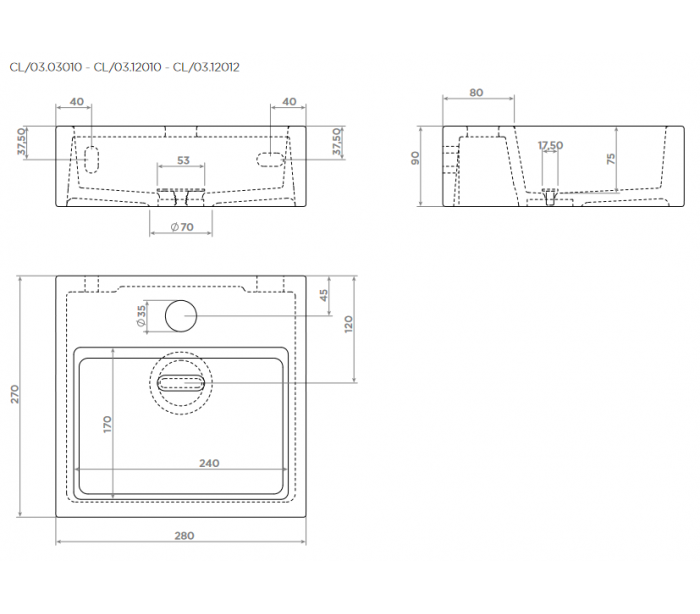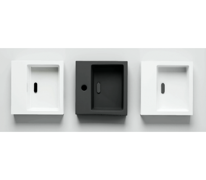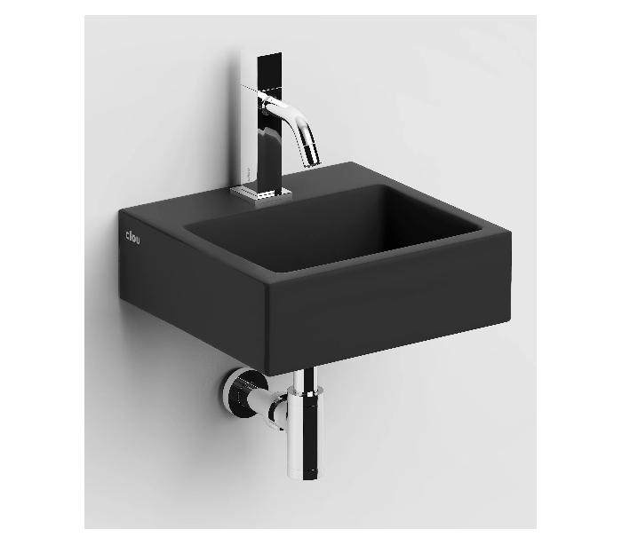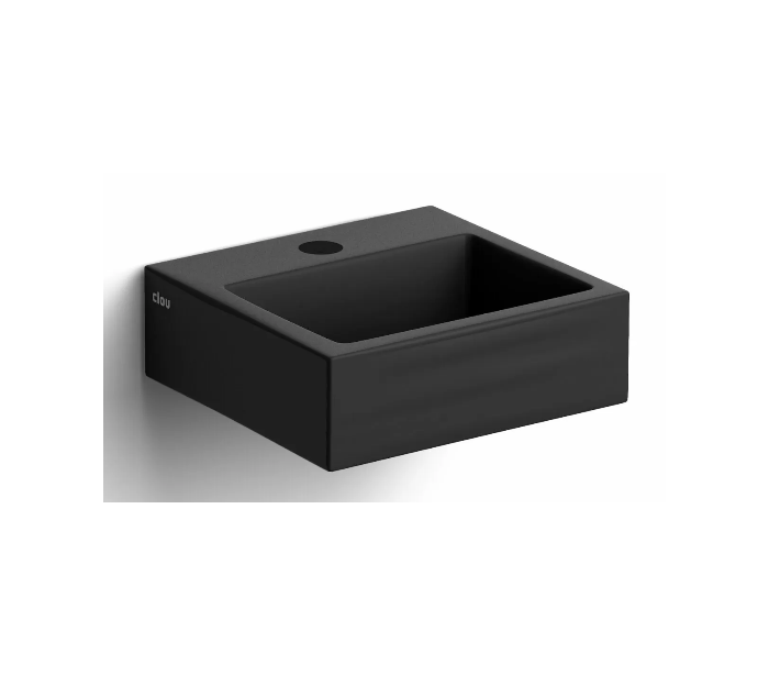 FLUSH 1 Håndvask til montering enten på væg eller bord. Håndvasken er udført i et design af mat sort keramik. Håndvasken måler 9 cm i højden og 28 x 27 cm i bredde og dybde. Der er i denne håndvask et forboret hul til armatur. Monteringssæt samt bundventil medfølger.