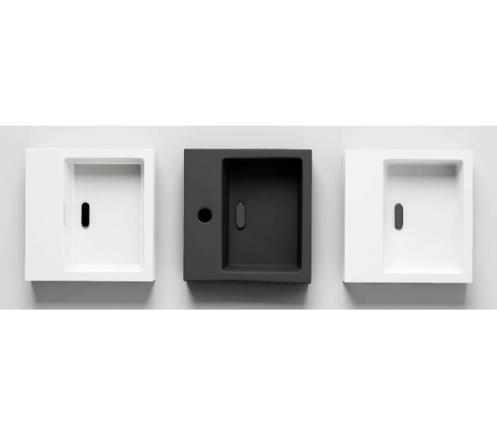 FLUSH 1 Håndvask til montering enten på væg eller bord. Håndvasken er udført i et design af hvid højglans mineralkomposit. Håndvasken måler 9 cm i højden og 28 x 27 cm i bredde og dybde. Der er i denne håndvask forberedt, men ikke forboret hul til armatur - kan undlades. Monteringssæt samt bundventil medfølger.