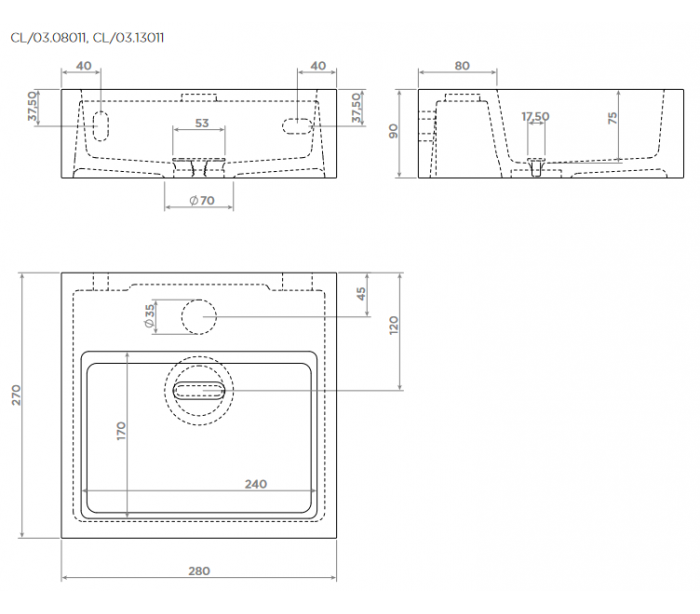 • Forberedt men ikke forboret armaturhul (kan blot undlades)
