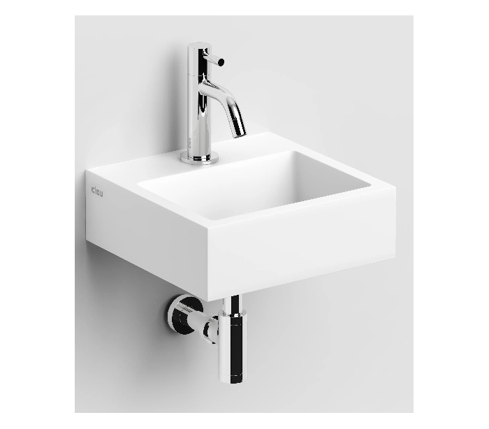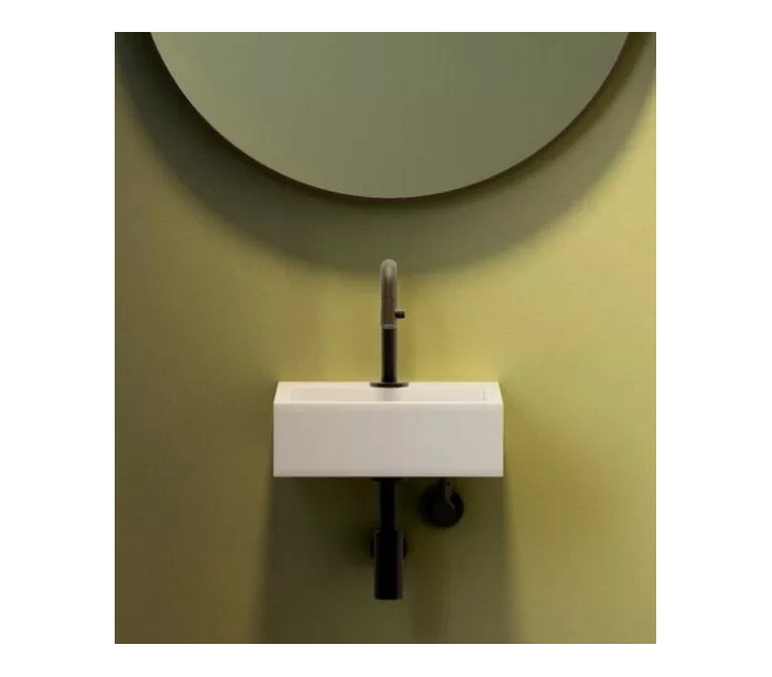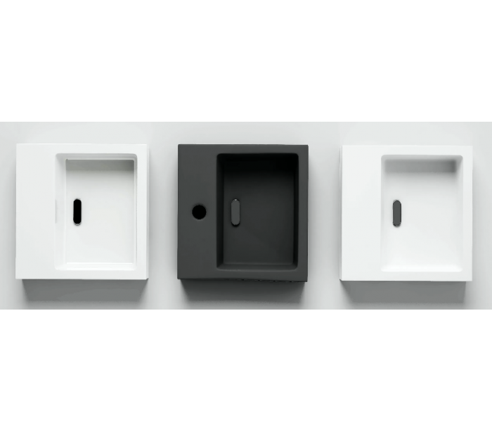 FLUSH 1 Håndvask til montering enten på væg eller bord. Håndvasken er udført i et design af mat hvid aluite. Håndvasken måler 9 cm i højden og 28 x 27 cm i bredde og dybde. Der er i denne håndvask forberedt, men ikke forboret hul til armatur - kan undlades. Monteringssæt samt bundventil medfølger.