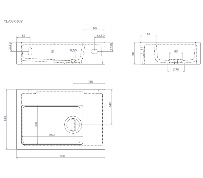 FLUSH 2 Håndvask til montering enten på væg eller bord. Håndvasken er udført i et design af hvid højglans keramik. Håndvasken måler 9 cm i højden og 36 x 24,5 cm i bredde og dybde. Der er i denne håndvask ikke et forboret hul til armatur. Monteringssæt samt bundventil medfølger.