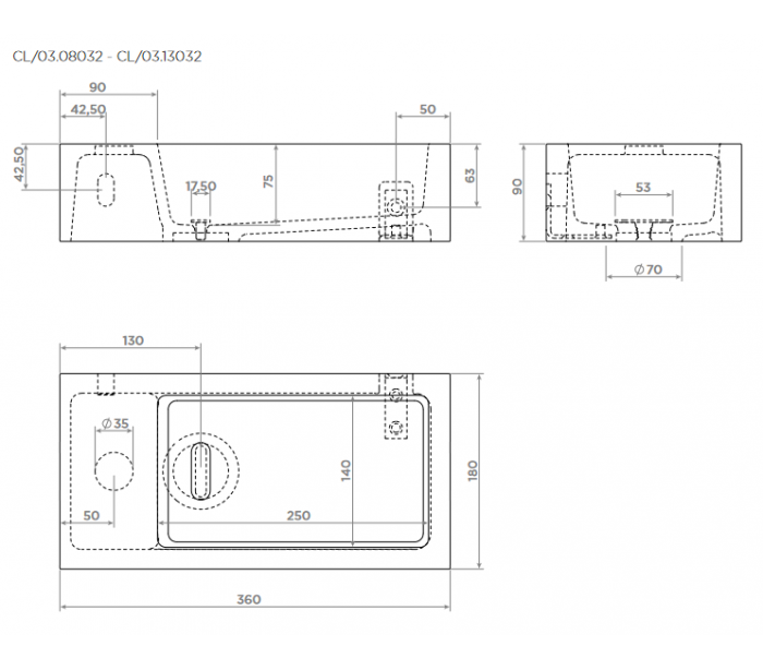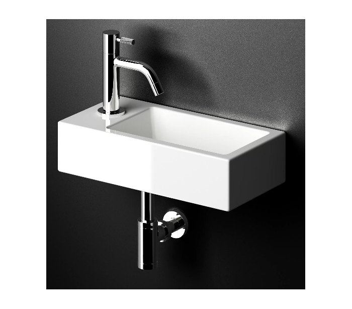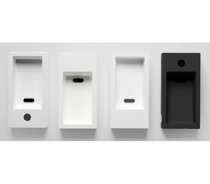 FLUSH 3 Håndvask til montering enten på væg eller bord. Håndvasken er udført i et design af hvid højglans mineralkomposit. Håndvasken måler 9 cm i højden og 36 x 18 cm i bredde og dybde. Der er i denne håndvask forberedt, men ikke forboret hul til armatur - kan undlades. Monteringssæt samt bundventil medfølger.