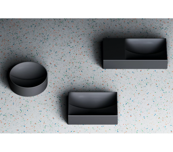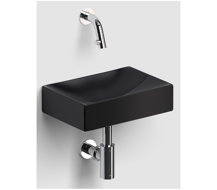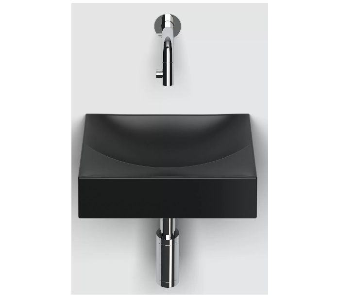 VALE Håndvask til montering enten på væg eller bord. Håndvasken er udført i et design af mat sort keramik. Håndvasken måler 7 cm i højden og 28 x 19 cm i bredde og dybde. Der er i denne håndvask ikke et forboret hul til armatur. Monteringssæt samt integreret afløb medfølger.