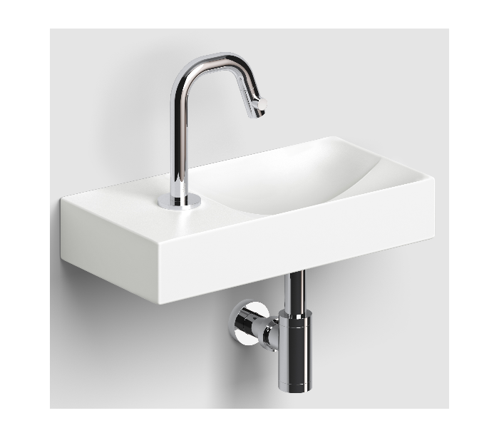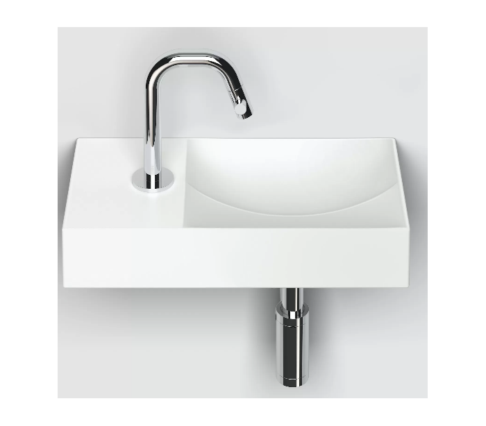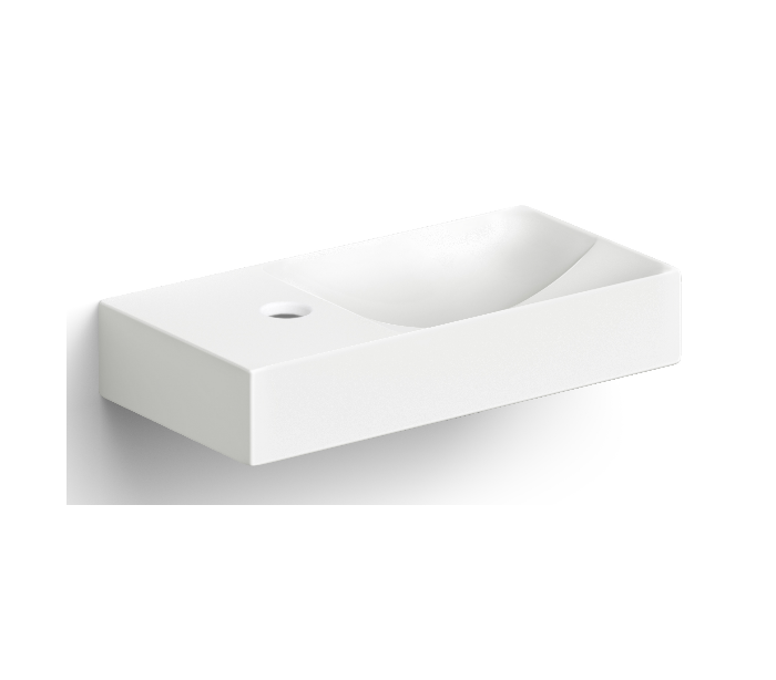 VALE Håndvask til montering enten på væg eller bord. Håndvasken er udført i et design af mat hvid keramik. Håndvasken måler 7 cm i højden og 38 x 19 cm i bredde og dybde. Der er i denne håndvask et forboret hul til armatur. Monteringssæt samt integreret afløb medfølger.