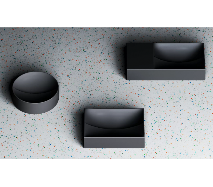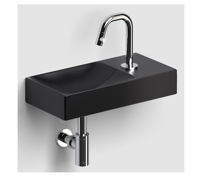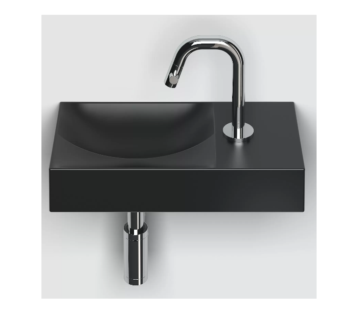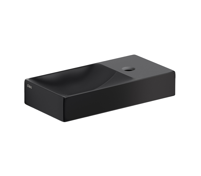 VALE Håndvask til montering enten på væg eller bord. Håndvasken er udført i et design af mat sort keramik. Håndvasken måler 7 cm i højden og 38 x 19 cm i bredde og dybde. Der er i denne håndvask et forboret hul til armatur. Monteringssæt samt integreret afløb medfølger.