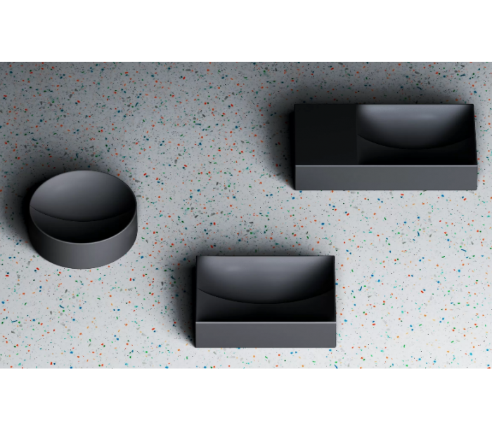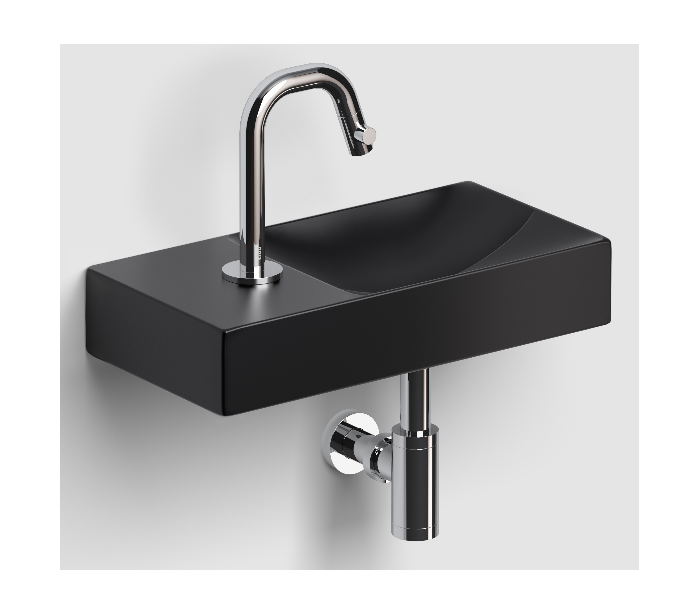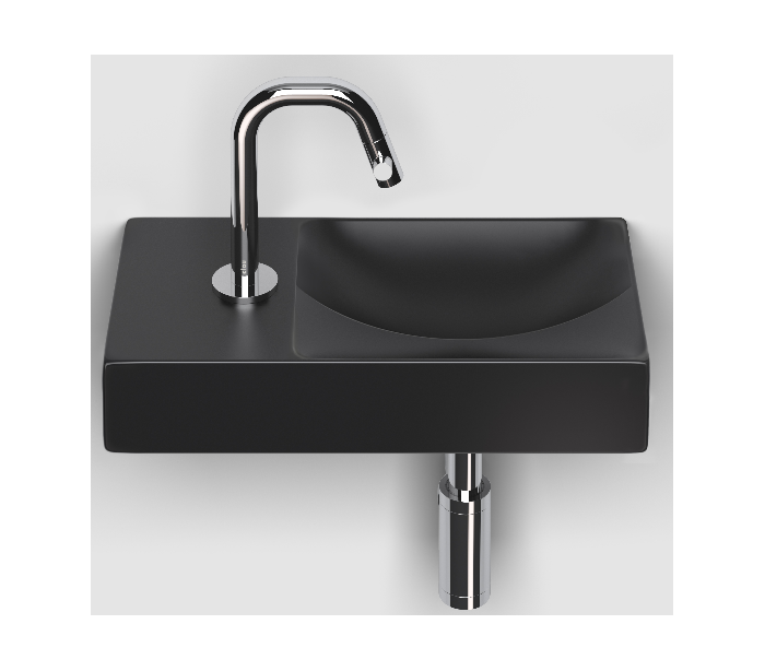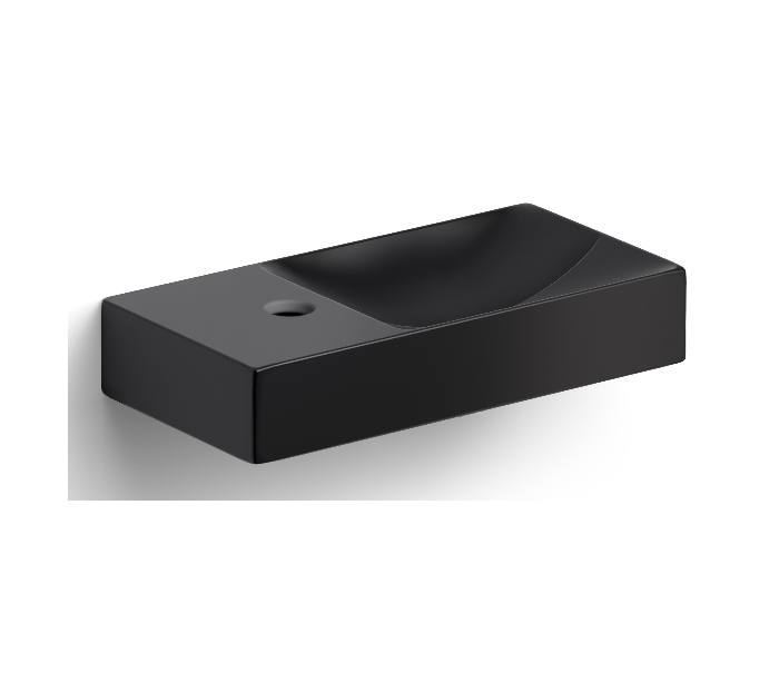 VALE Håndvask til montering enten på væg eller bord. Håndvasken er udført i et design af mat sort keramik. Håndvasken måler 7 cm i højden og 38 x 19 cm i bredde og dybde. Der er i denne håndvask et forboret hul til armatur. Monteringssæt samt integreret afløb medfølger.