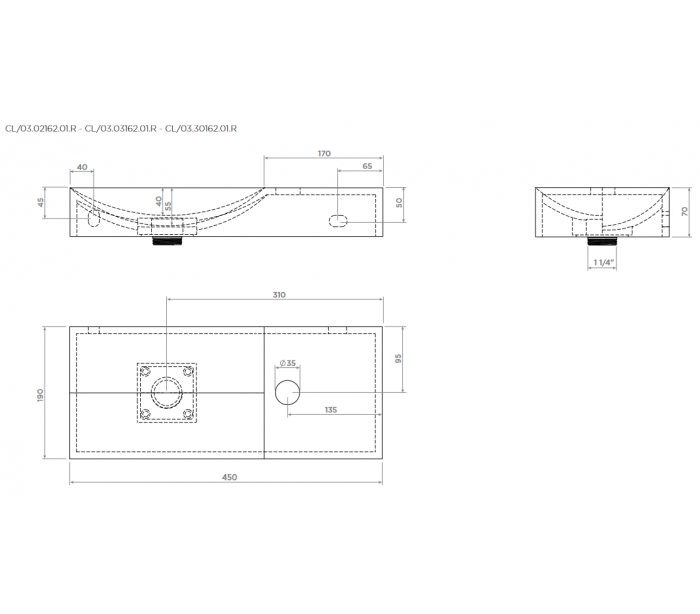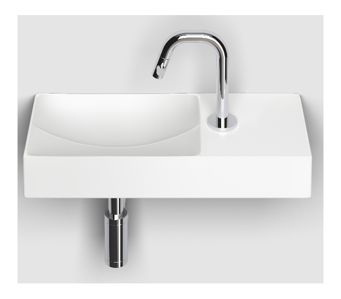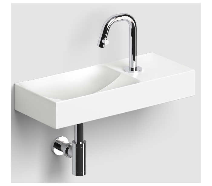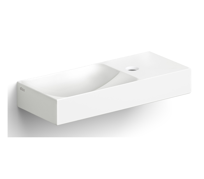 VALE Håndvask til montering enten på væg eller bord. Håndvasken er udført i et design af mat hvid keramik. Håndvasken måler 7 cm i højden og 45 x 19 cm i bredde og dybde. Der er i denne håndvask et forboret hul til armatur. Monteringssæt samt integreret afløb medfølger.
