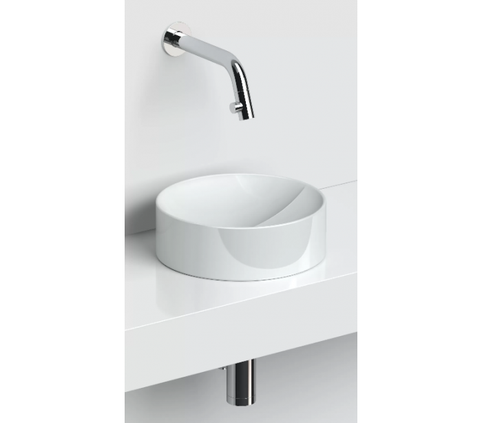 VALE Rund håndvask til bordmontering, udført i et design af hvid højglans keramik. Håndvasken måler 7 cm i højden og 22 cm i diameter. Monteringssæt samt integreret afløb medfølger.