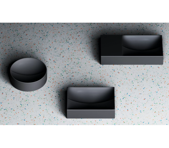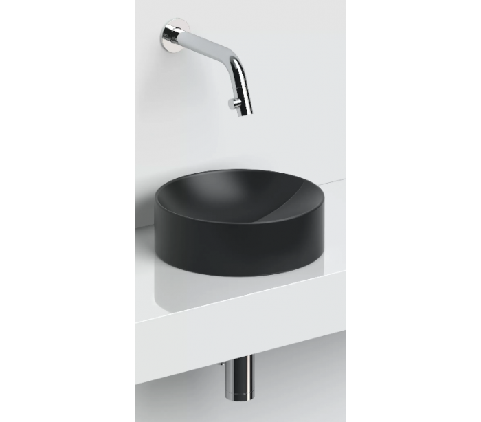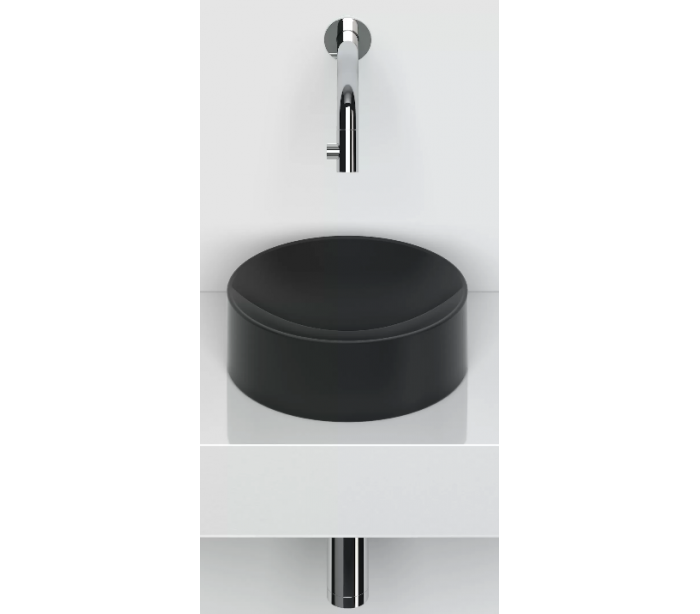 VALE Rund håndvask til bordmontering, udført i et design af mat sort keramik. Håndvasken måler 7 cm i højden og 22 cm i diameter. Monteringssæt samt integreret afløb medfølger.