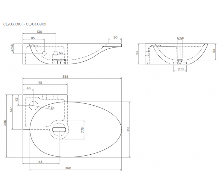 • Forberedt men ikke forboret armaturhul (kan blot undlades)