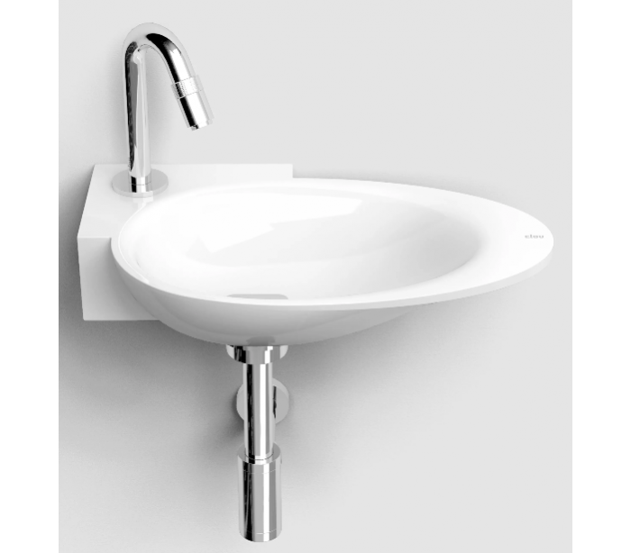 FIRST Håndvask til vægmontering, udført i et design af hvid højglans mineralkomposit. Håndvasken måler 8 cm i højden og 38,8 x 24,6 cm i bredde og dybde. Der er i denne håndvask forberedt, men ikke forboret hul til armatur - kan undlades. Monteringssæt samt bundventil medfølger.