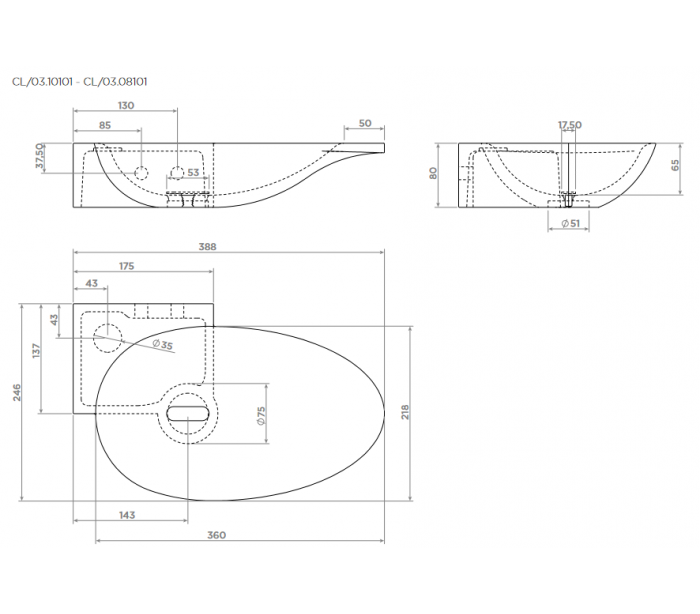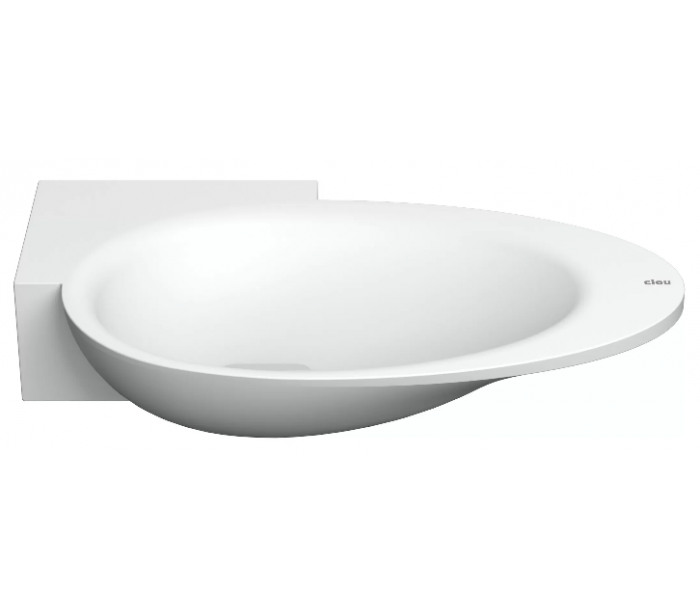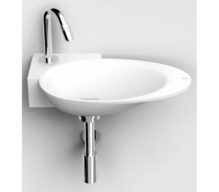 FIRST Håndvask til vægmontering, udført i et design af mat hvid aluite. Håndvasken måler 8 cm i højden og 38,8 x 24,6 cm i bredde og dybde. Der er i denne håndvask forberedt, men ikke forboret hul til armatur - kan undlades. Monteringssæt samt bundventil medfølger.