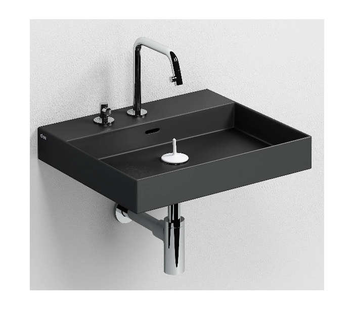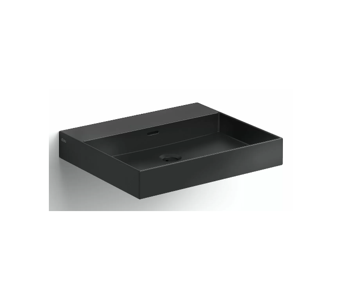 NEW WASH ME Håndvask til montering enten på væg eller bord. Håndvasken er udført i et design af mat sort keramik. Håndvasken måler 8 cm i højden og 50 x 42 cm i bredde og dybde. Der er i denne håndvask ikke et forboret hul til armatur. Monteringssæt medfølger.