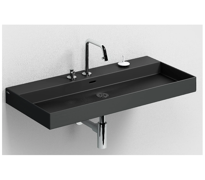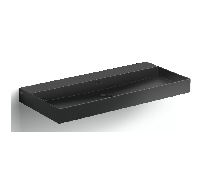 NEW WASH ME Håndvask til montering enten på væg eller bord. Håndvasken er udført i et design af mat sort keramik. Håndvasken måler 8 cm i højden og 90 x 42 cm i bredde og dybde. Der er i denne håndvask ikke et forboret hul til armatur. Monteringssæt medfølger.
