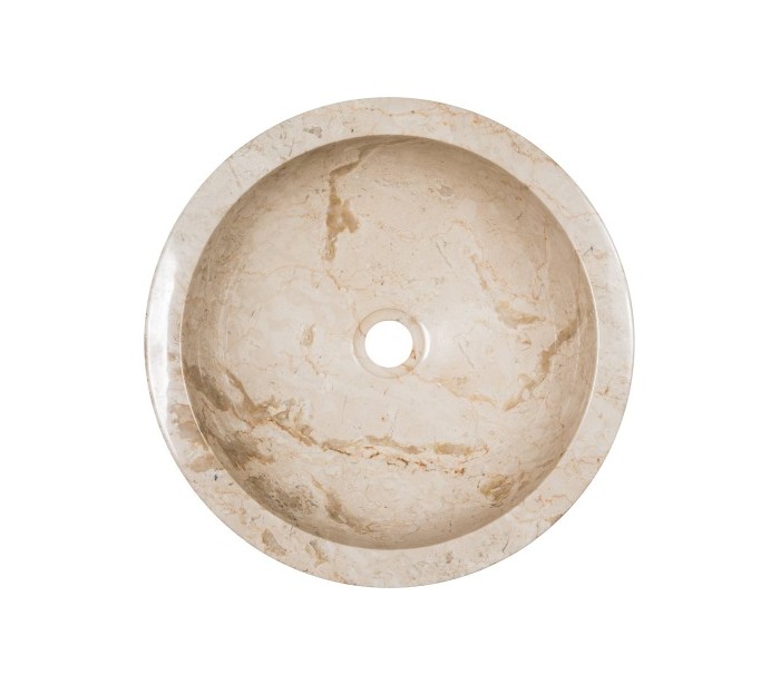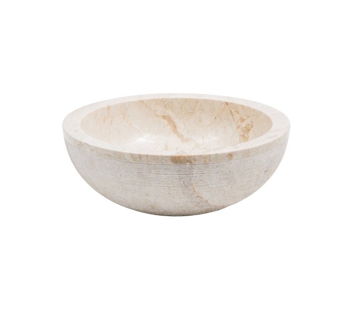 Rund håndvask udført i et design i beige marmor. Håndvasken måler 15 cm i højden og 40 cm i diameter. Håndvasken leveres uden bundventil (standard 1 1/4").