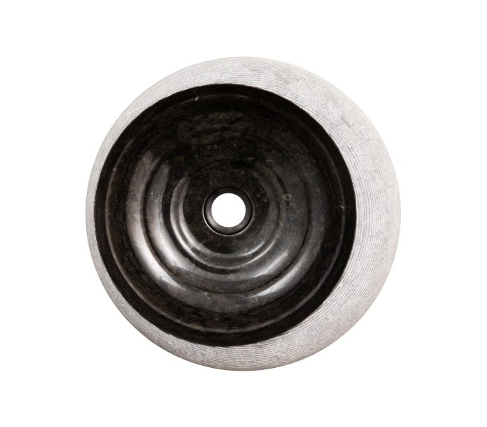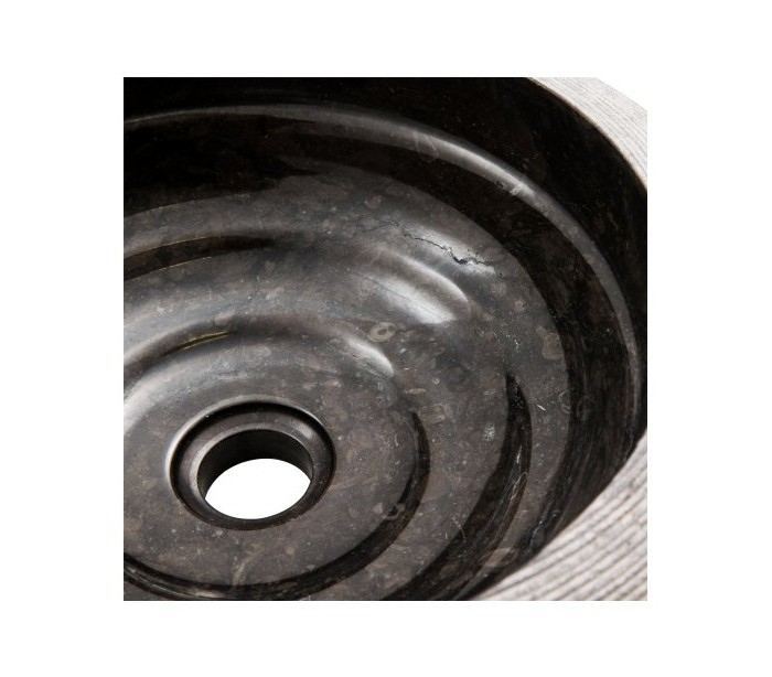 Rund håndvask udført i et design i sort og grå marmor. Håndvasken måler 13 cm i højden og 40 cm i diameter. Håndvasken leveres uden bundventil (standard 1 1/4").