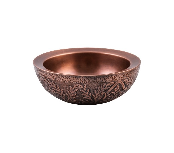 Rund håndvask udført i et design i antik kobber. Håndvasken måler 16 cm i højden og 40 cm i diameter. Håndvasken leveres uden bundventil (standard 1 1/4").