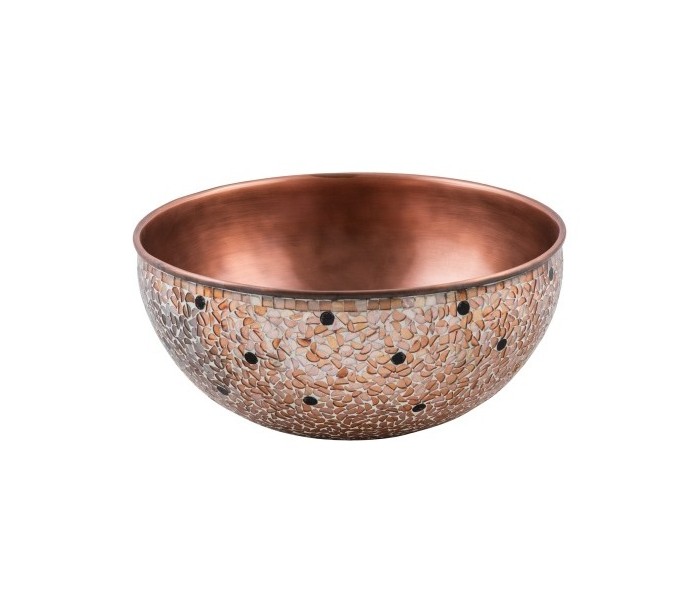 Rund håndvask udført i et design i antik kobber og mosaik glas. Håndvasken måler 19 cm i højden og 38 cm i diameter. Håndvasken leveres uden bundventil (standard 1 1/4").