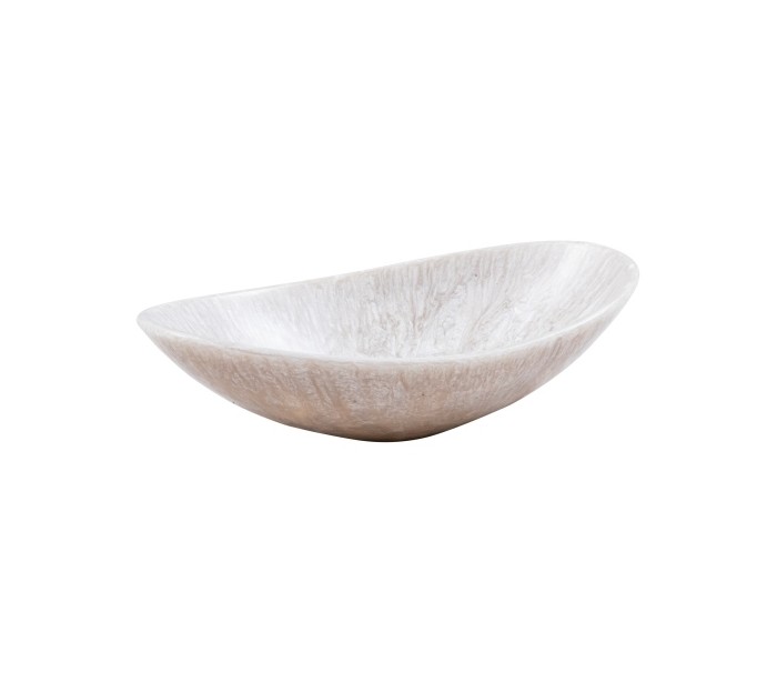 Oval håndvask udført i et design i hvid og beige resin. Håndvasken måler 15 cm i højden og 52 x 35 cm i bredde og dybde. Håndvasken leveres uden bundventil (standard 1 1/4").