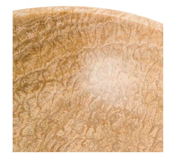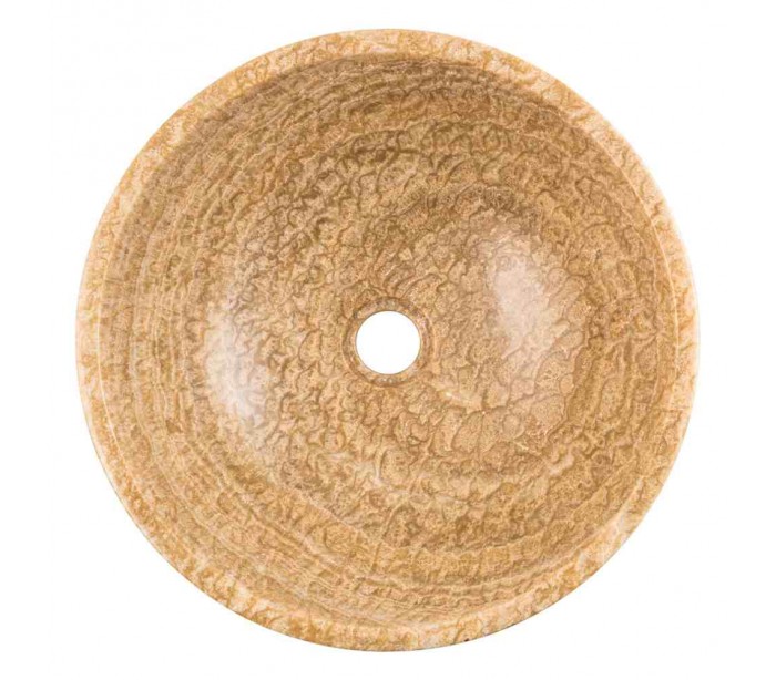 Rund håndvask udført i et design i beige onyx sten. Håndvasken måler 15 cm i højden og 40 cm i diameter. Håndvasken leveres uden bundventil (standard 1 1/4").
