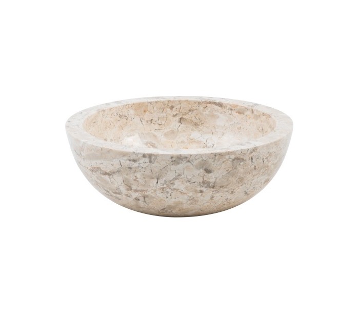 Rund håndvask udført i et design i beige marmor. Håndvasken måler 15 cm i højden og 40 cm i diameter. Håndvasken leveres uden bundventil (standard 1 1/4").