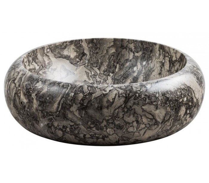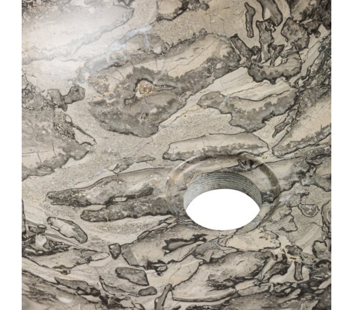 Rund håndvask udført i et design i grå marmor. Håndvasken måler 15 cm i højden og 40 cm i diameter. Håndvasken leveres uden bundventil (standard 1 1/4").