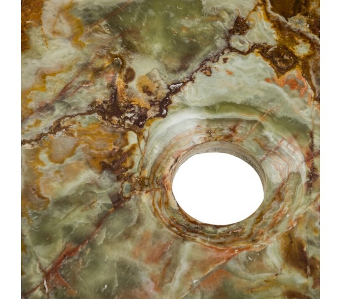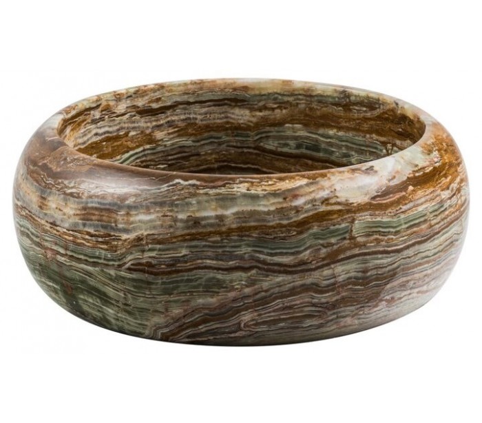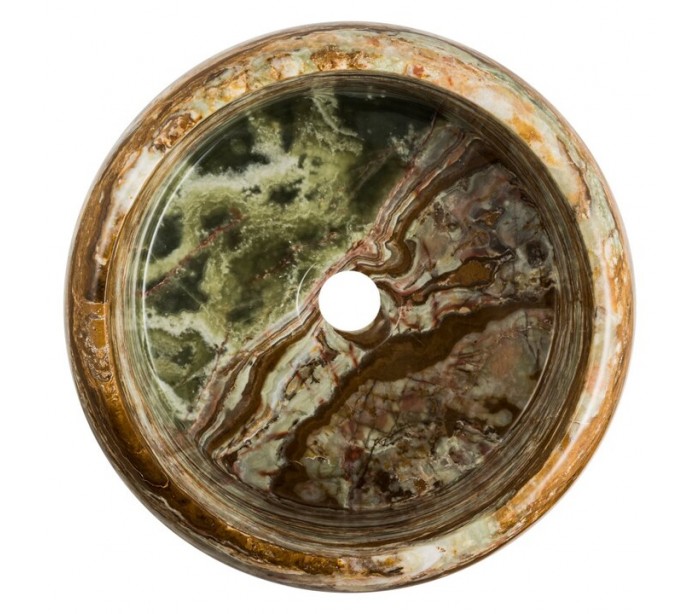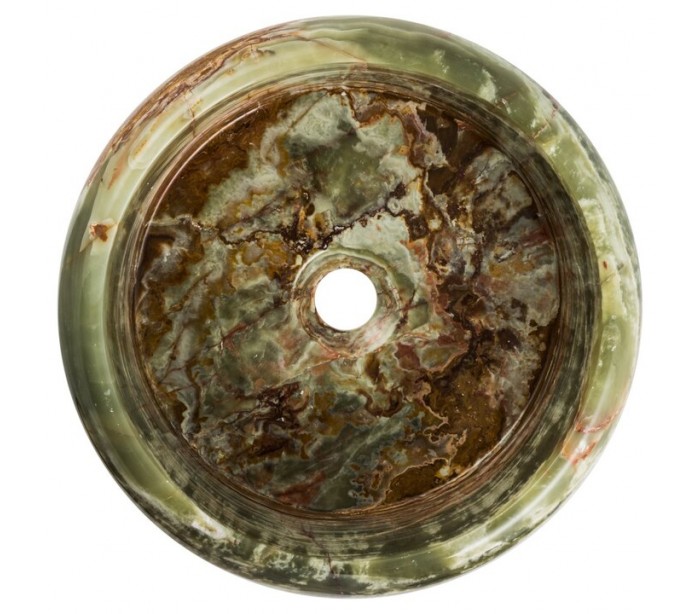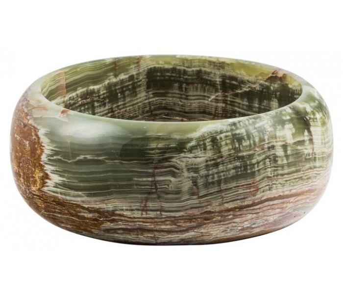 Rund håndvask udført i et design i grøn onyx sten. Håndvasken måler 15 cm i højden og 40 cm i diameter. Håndvasken leveres uden bundventil (standard 1 1/4").