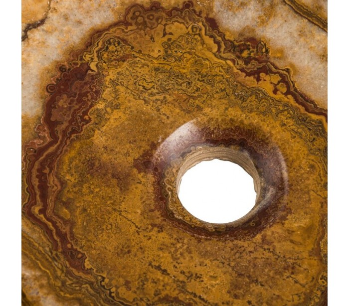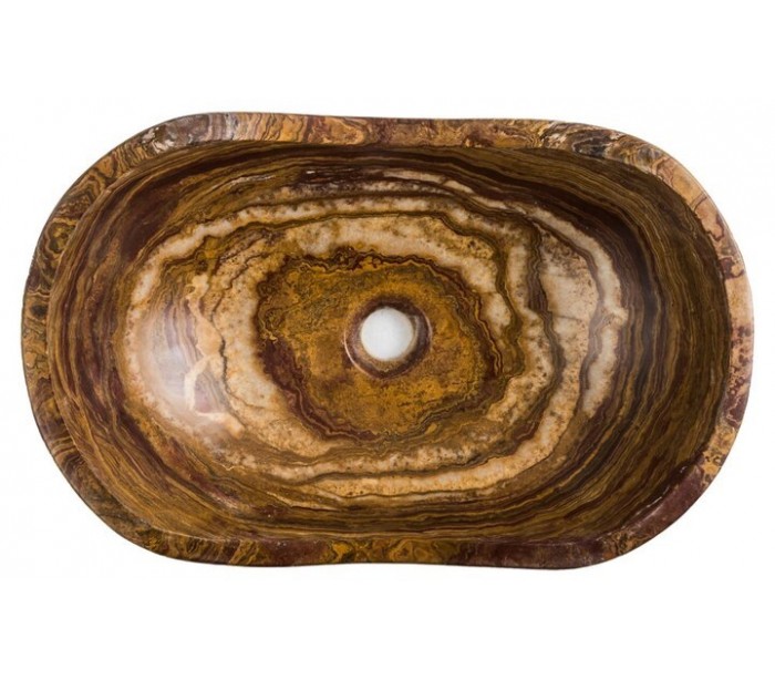 Håndvask udført i et design i brun onyx sten. Håndvasken måler 15 cm i højden og 53 x 35 cm i bredde og dybde. Håndvasken leveres uden bundventil (standard 1 1/4").