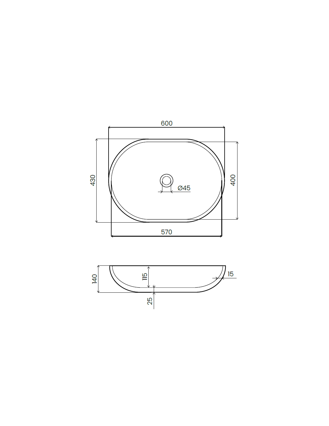 Håndvask udført i et design af sort granit. Håndvasken måler 14 cm i højden og 60 x 43,5 cm i bredde og dybde. Håndvasken leveres uden bundventil (standard 1 1/4").