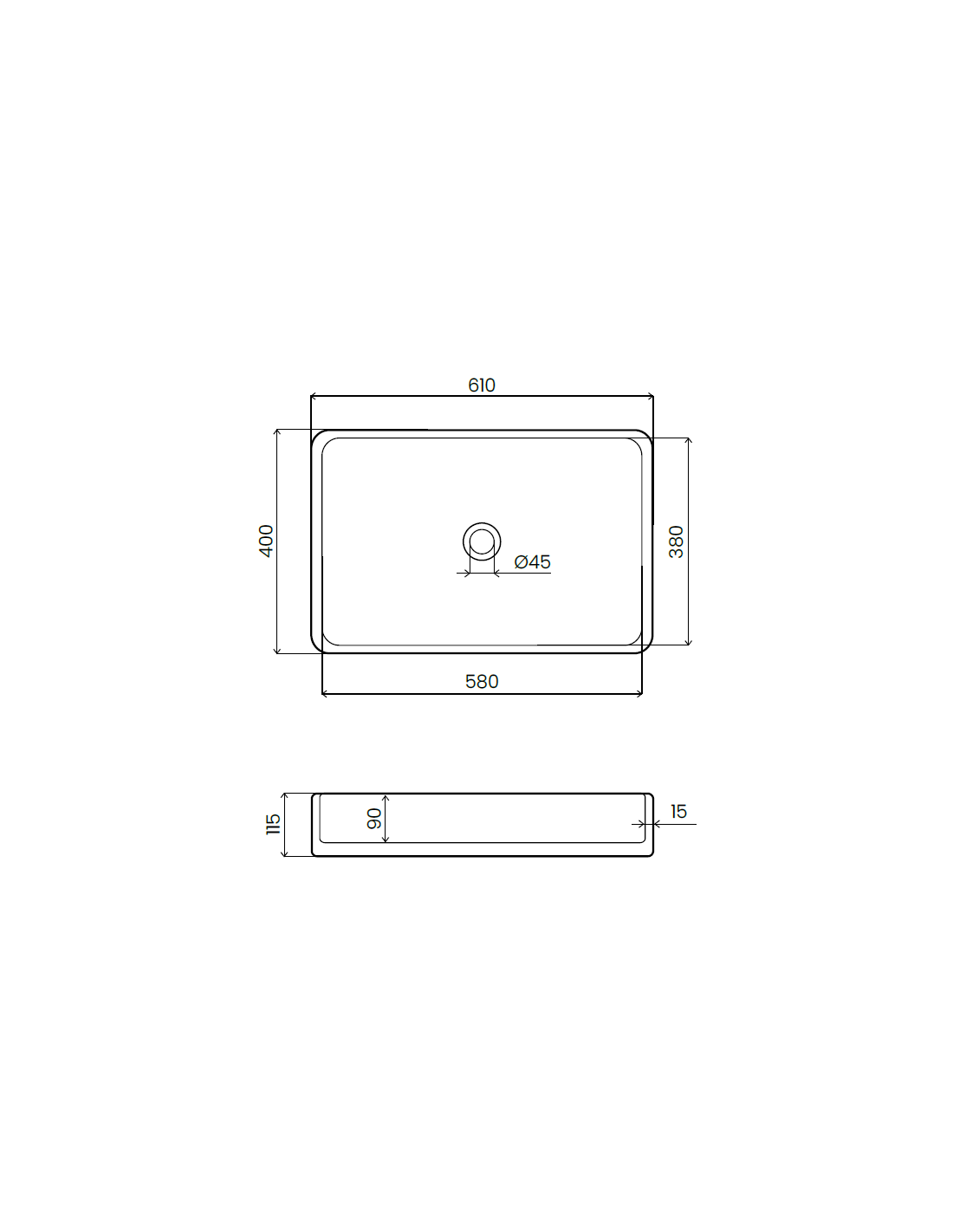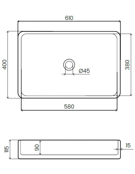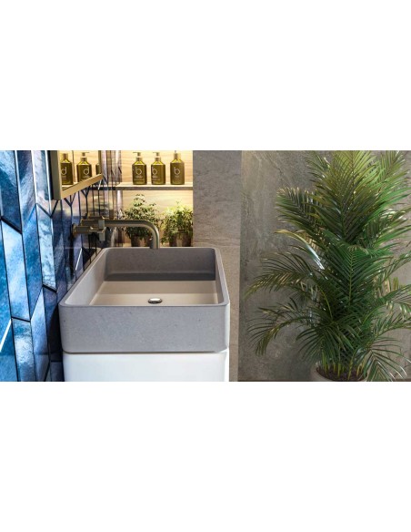Håndvask udført i et design af grå marmor. Håndvasken måler 11,5 cm i højden og 61 x 41 cm i bredde og dybde. Håndvasken leveres uden bundventil (standard 1 1/4").