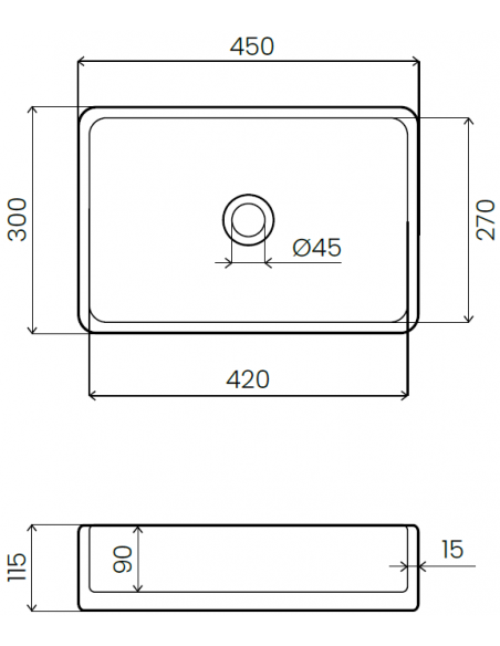 Håndvask udført i et design af grå marmor. Håndvasken måler 11,5 cm i højden og 45 x 30 cm i bredde og dybde. Håndvasken leveres uden bundventil (standard 1 1/4").