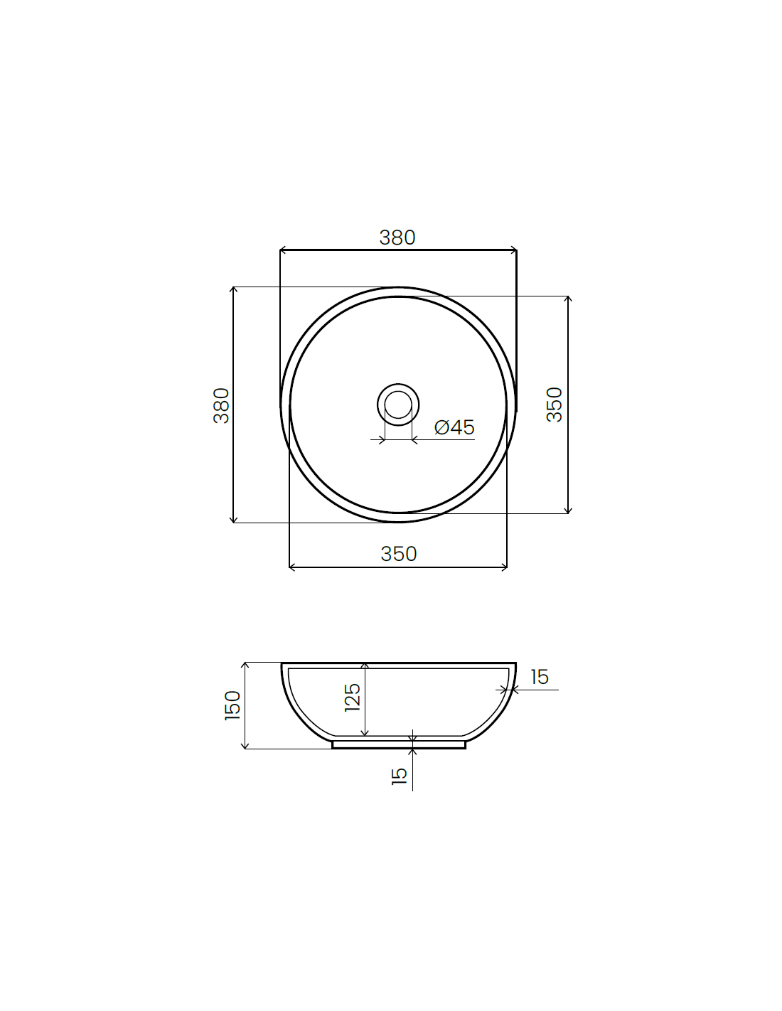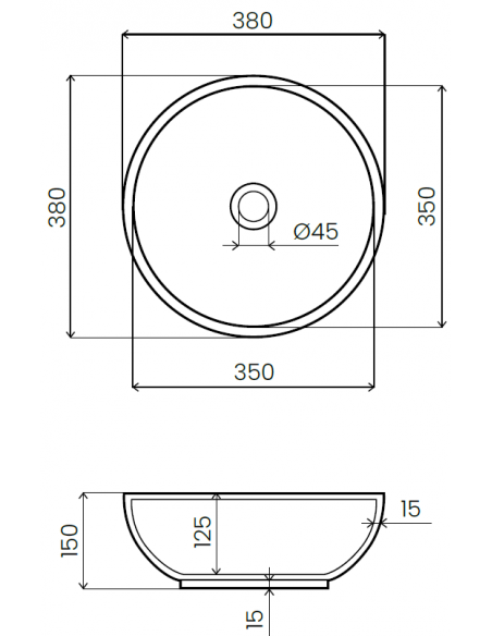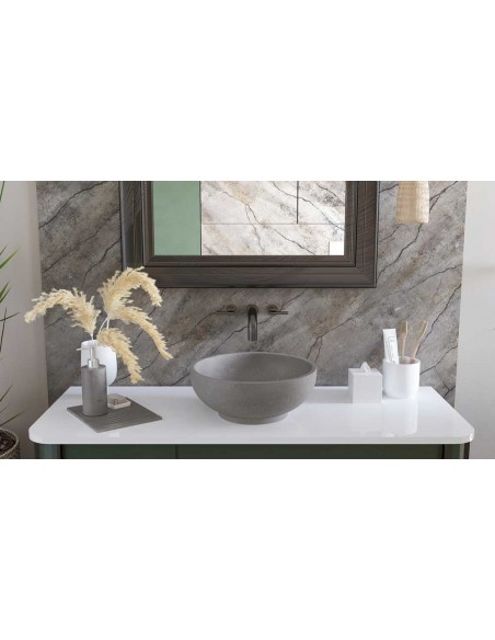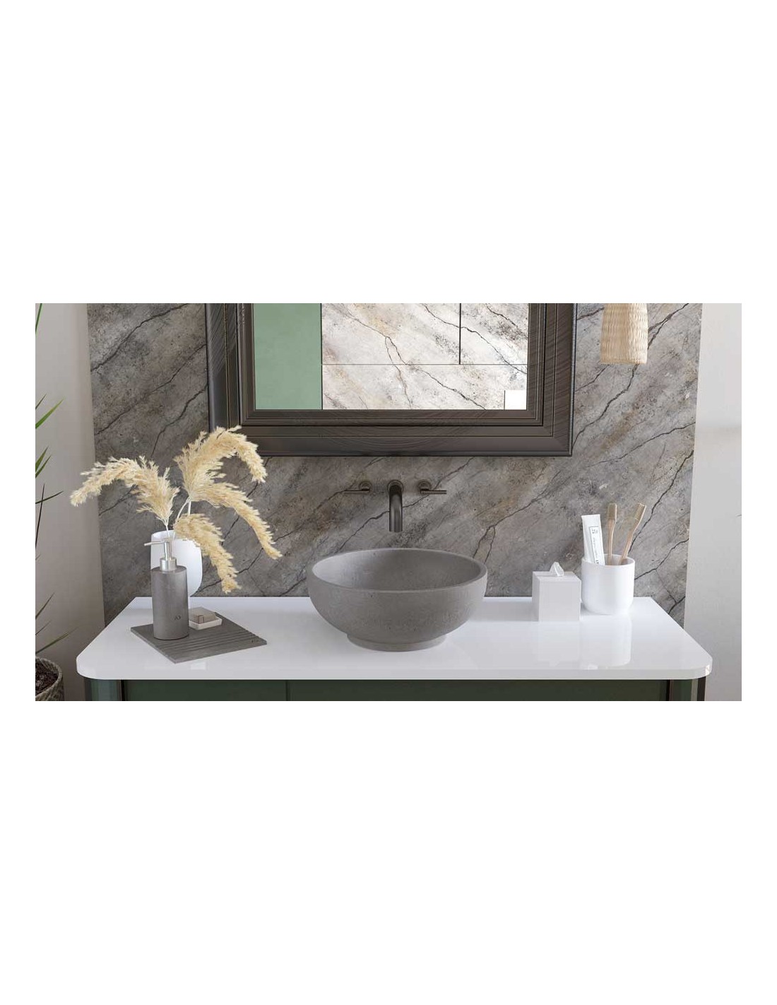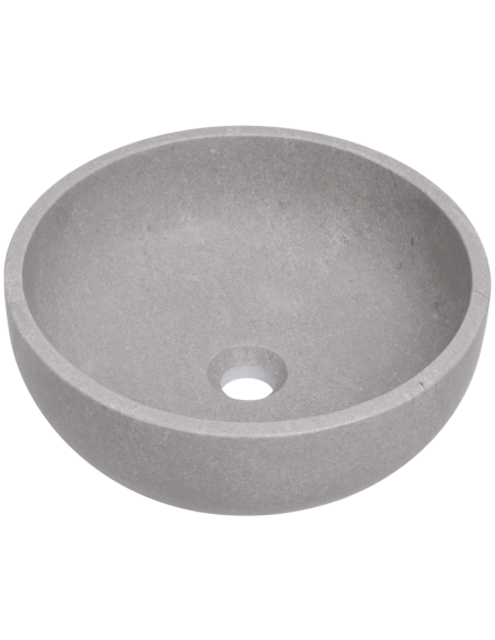 Håndvask udført i et design af grå marmor. Håndvasken måler 15 cm i højden og 38 cm i diameter. Håndvasken leveres uden bundventil (standard 1 1/4").