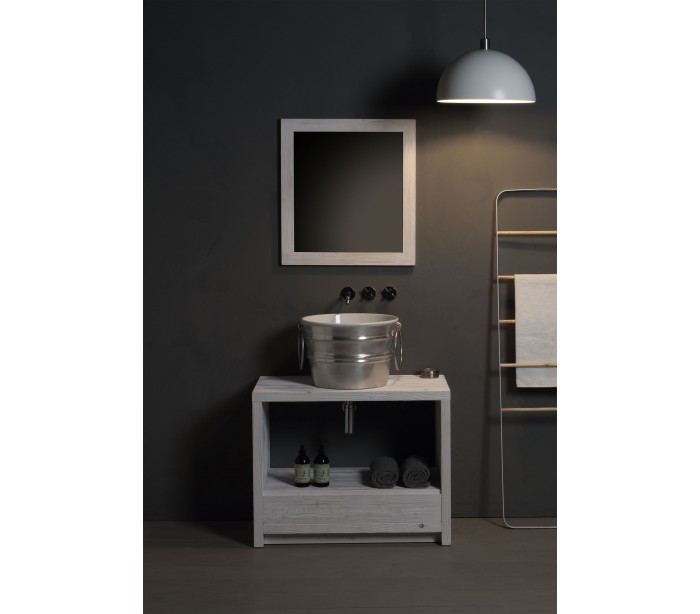 Håndvask i et moderne design, fremstillet med inderside i hvid keramik og med yderside og bundventil i sølvfarvet keramik. En smuk håndvask fra italienske Horganica, fremstillet i hånden og med bundventil i samme farve som vaskens yderside. Denne udgave er med håndklædering i kromlakeret messing.