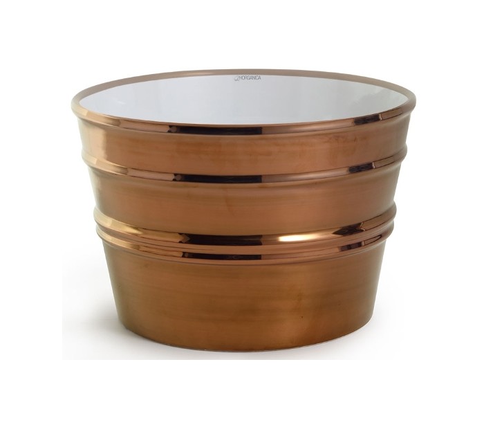 Håndvask i et moderne design, fremstillet med inderside i hvid keramik og med yderside og bundventil i kobberfarvet keramik. En smuk håndvask fra italienske Horganica, fremstillet i hånden og med bundventil i samme farve som vaskens yderside.