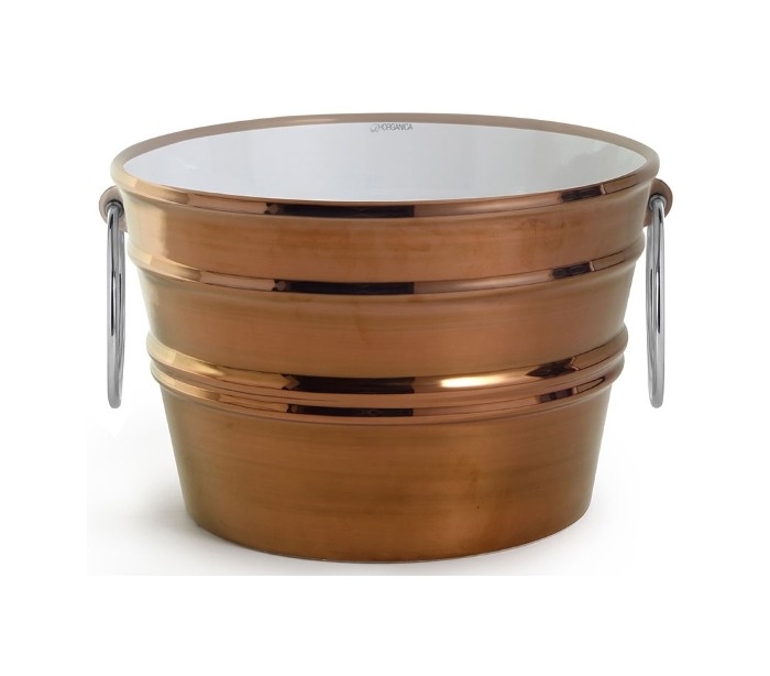 Håndvask i et moderne design, fremstillet med inderside i hvid keramik og med yderside og bundventil i kobberfarvet keramik. En smuk håndvask fra italienske Horganica, fremstillet i hånden og med bundventil i samme farve som vaskens yderside. Denne udgave er med håndklædering i kromlakeret messing.