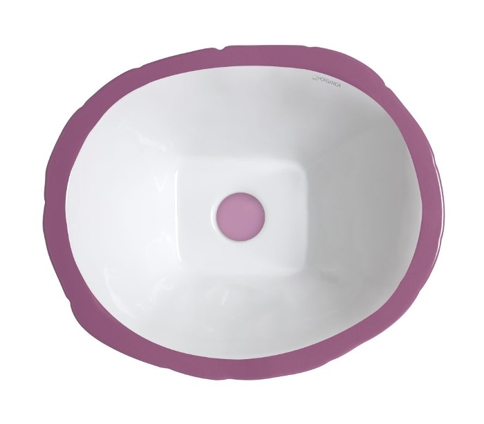 Håndvask i et moderne design, fremstillet med inderside i hvid keramik og med yderside og bundventil i lilla keramik. En smuk håndvask fra italienske Horganica, fremstillet i hånden og med bundventil i samme farve som vaskens yderside.