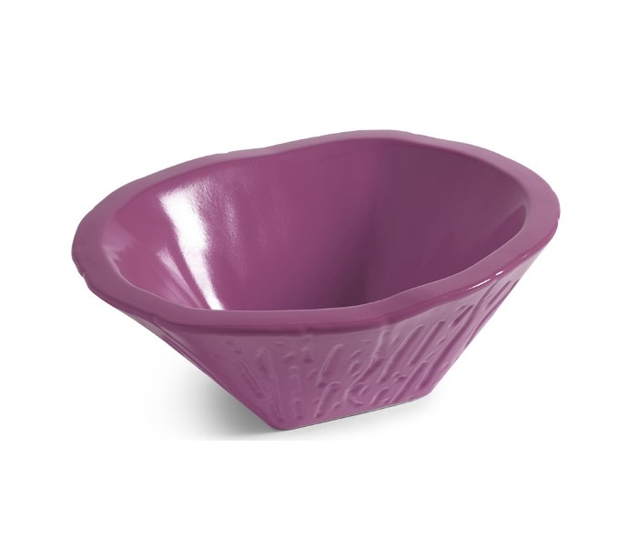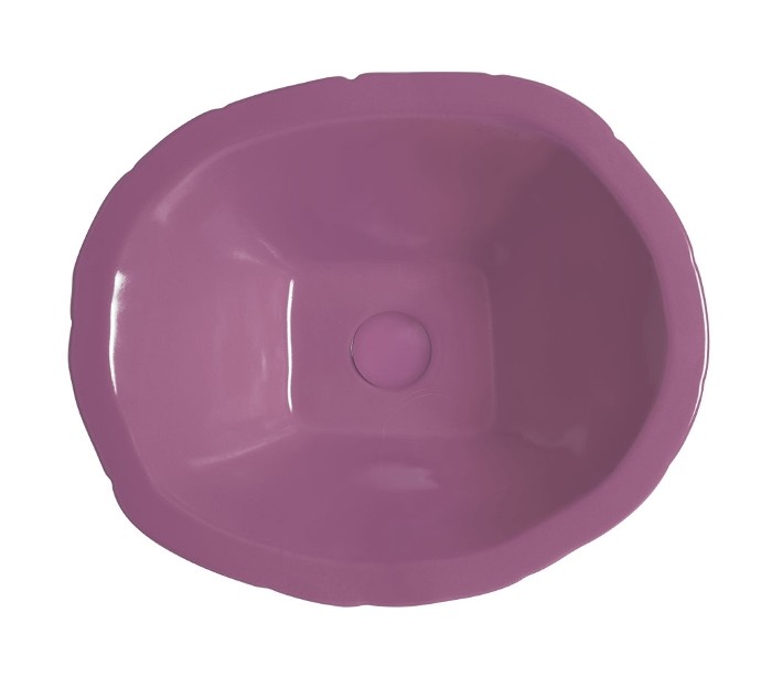 Håndvask i et moderne design, fremstillet med inderside i lilla keramik og med yderside og bundventil i lilla keramik. En smuk håndvask fra italienske Horganica, fremstillet i hånden og med bundventil i samme farve som vaskens yderside.