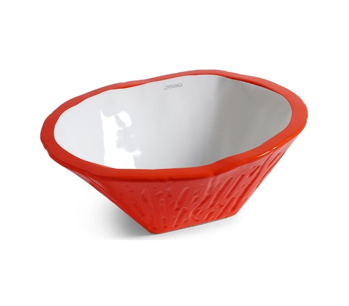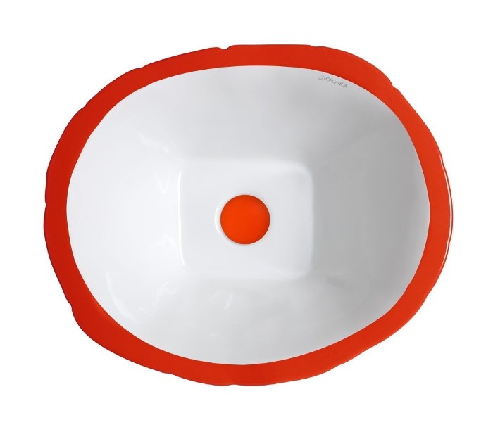 Håndvask i et moderne design, fremstillet med inderside i hvid keramik og med yderside og bundventil i passionsrød keramik. En smuk håndvask fra italienske Horganica, fremstillet i hånden og med bundventil i samme farve som vaskens yderside.