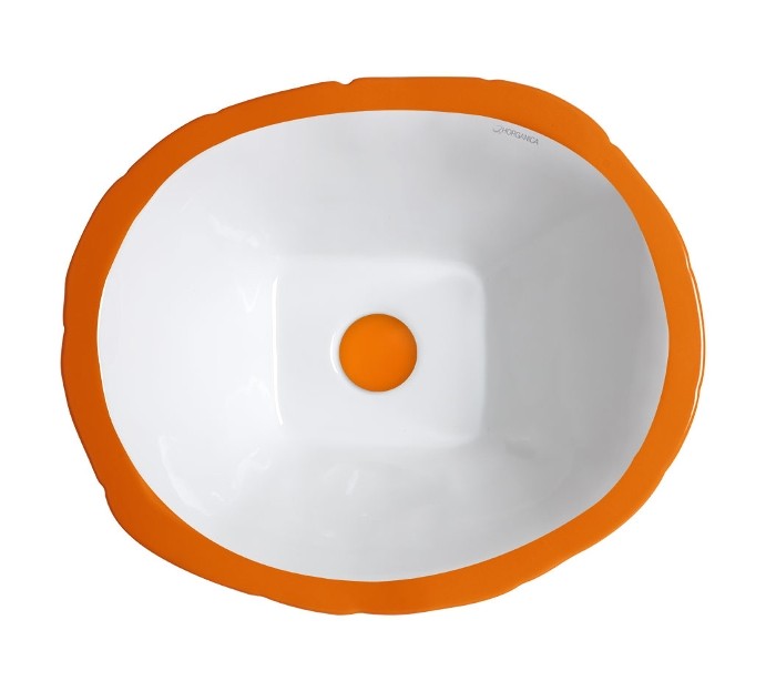Håndvask i et moderne design, fremstillet med inderside i hvid keramik og med yderside og bundventil i orange keramik. En smuk håndvask fra italienske Horganica, fremstillet i hånden og med bundventil i samme farve som vaskens yderside.
