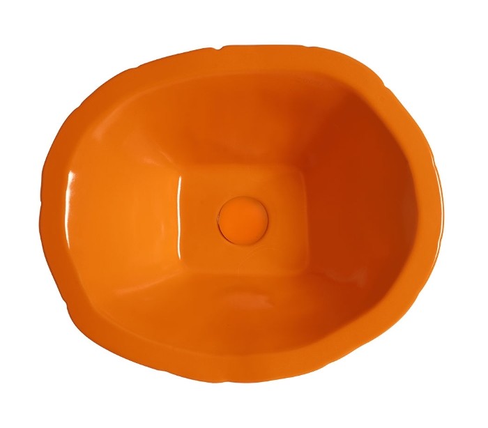 Håndvask i et moderne design, fremstillet med inderside i orange keramik og med yderside og bundventil i orange keramik. En smuk håndvask fra italienske Horganica, fremstillet i hånden og med bundventil i samme farve som vaskens yderside.