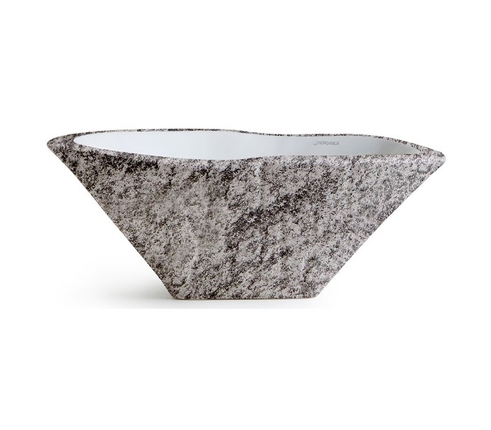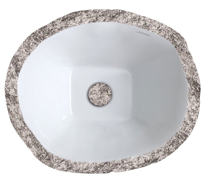 Håndvask i et moderne design, fremstillet med inderside i hvid keramik og med yderside og bundventil i keramik med gråbrun marmor effekt. En smuk håndvask fra italienske Horganica, fremstillet i hånden og med bundventil i samme farve som vaskens yderside.