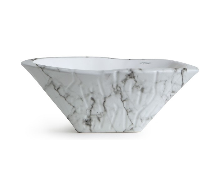 Håndvask i et moderne design, fremstillet med inderside i hvid keramik og med yderside og bundventil i keramik med hvid marmor effekt. En smuk håndvask fra italienske Horganica, fremstillet i hånden og med bundventil i samme farve som vaskens yderside.