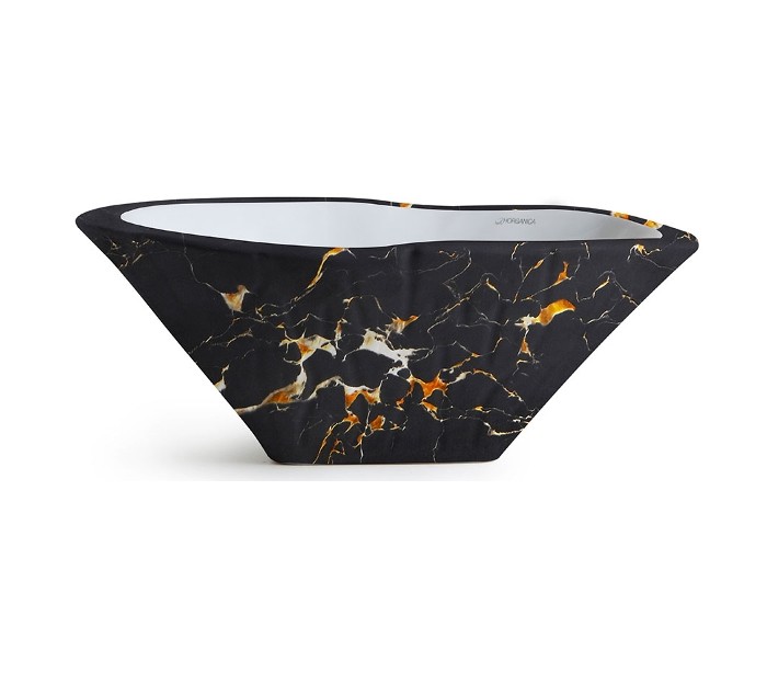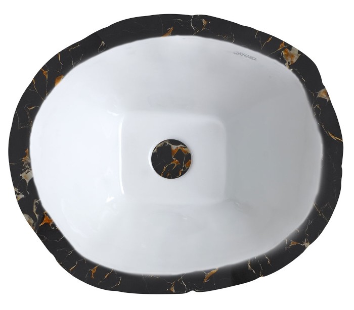 Håndvask i et moderne design, fremstillet med inderside i hvid keramik og med yderside og bundventil i keramik med sort marmor effekt. En smuk håndvask fra italienske Horganica, fremstillet i hånden og med bundventil i samme farve som vaskens yderside.