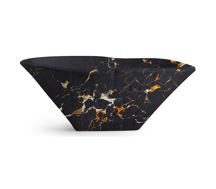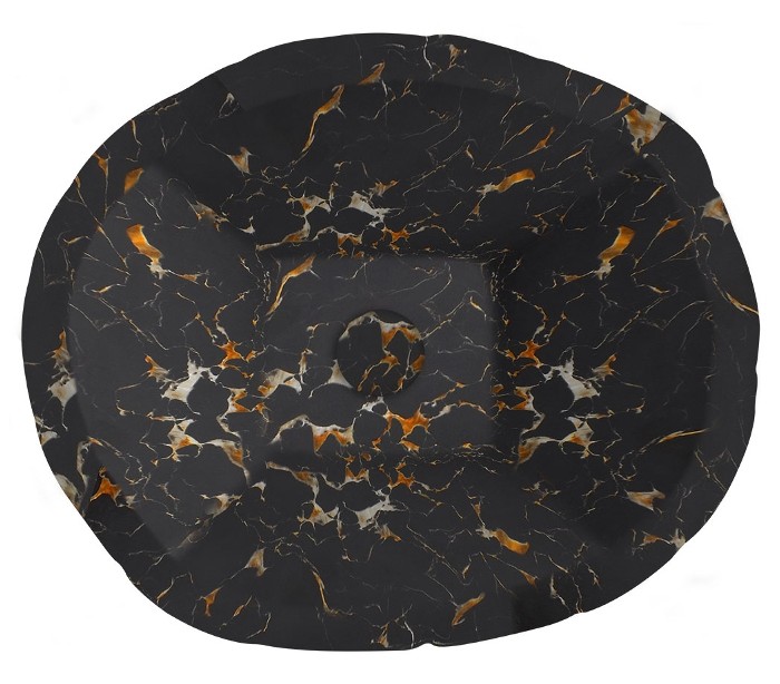 Håndvask i et moderne design, fremstillet i keramik med indersideeffekt af sort marmor og med yderside og bundventil i sort marmor effekt keramik. En smuk håndvask fra italienske Horganica, fremstillet i hånden og med bundventil i samme farve som vaskens yderside.