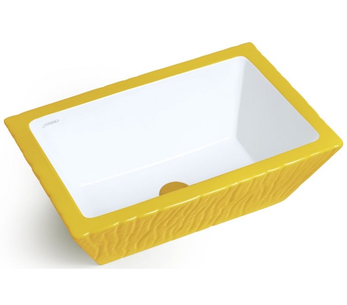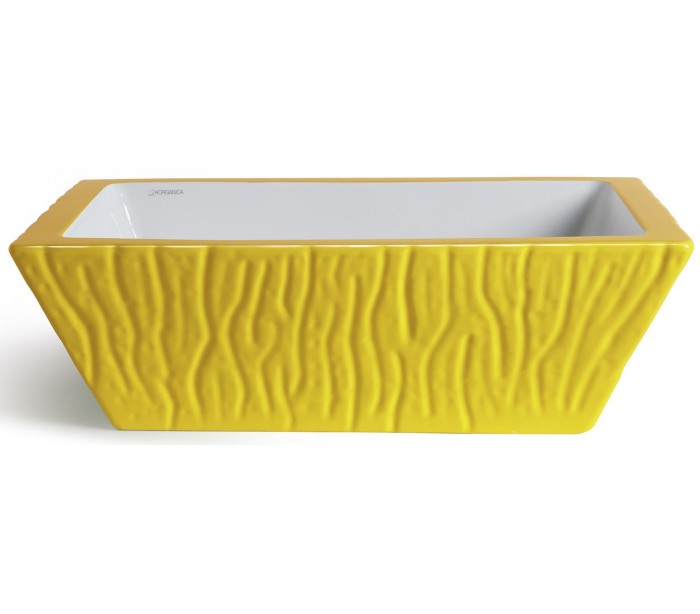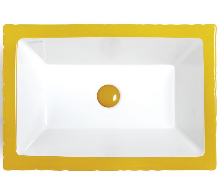 Håndvask i et moderne design, fremstillet med inderside i hvid keramik og med yderside og bundventil i solgul keramik. En smuk håndvask fra italienske Horganica, fremstillet i hånden og med bundventil i samme farve som vaskens yderside.