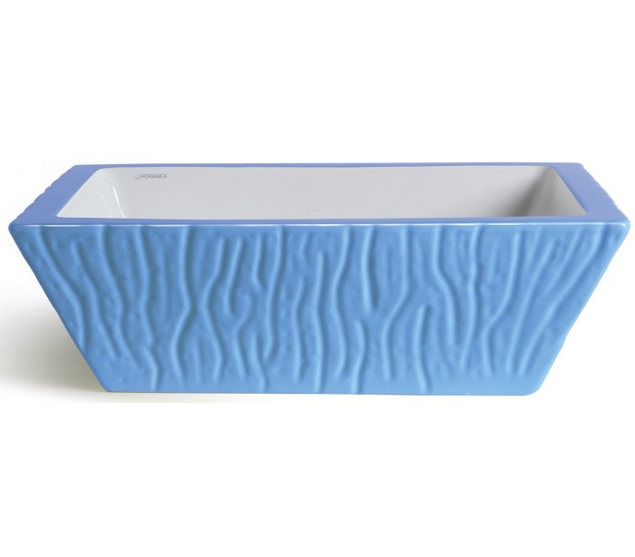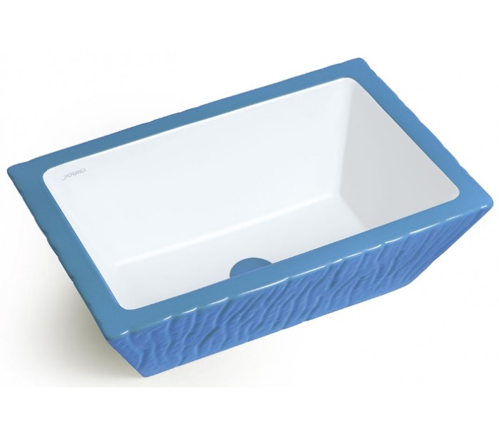 Håndvask i et moderne design, fremstillet med inderside i hvid keramik og med yderside og bundventil i cyan farvet keramik. En smuk håndvask fra italienske Horganica, fremstillet i hånden og med bundventil i samme farve som vaskens yderside.